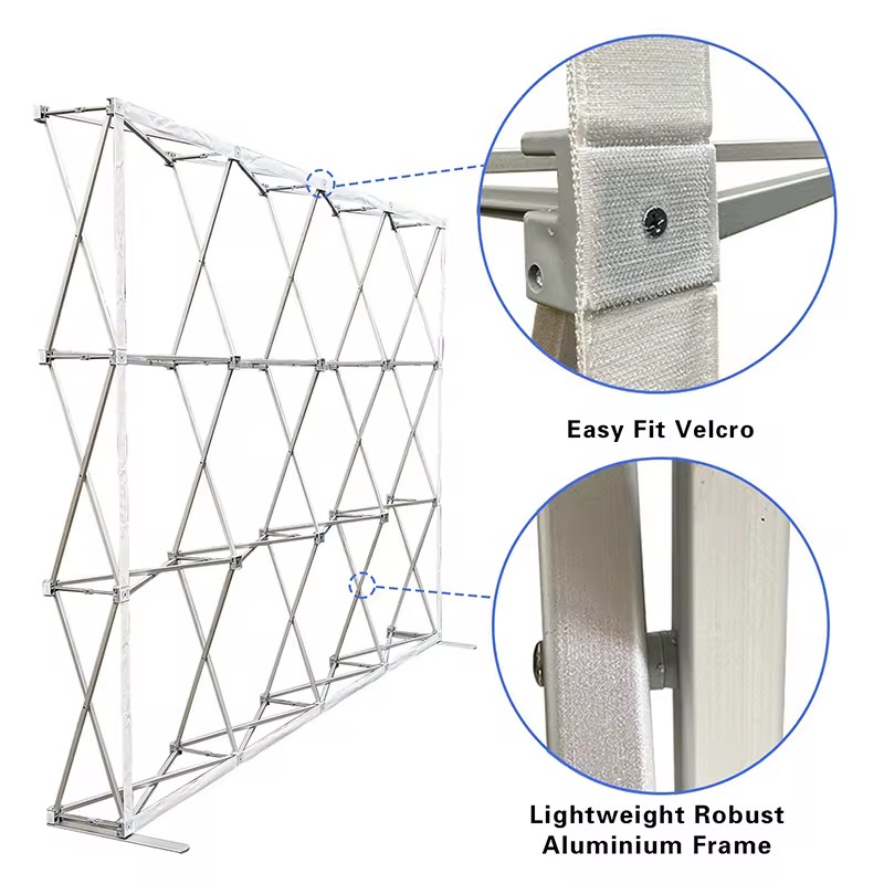 Sets Up in Minutes — No Tools Required The hop-up frame locks together with simple clips and yellow tensioning arms that pull the structure tight and keep it stable. The fabric graphic attaches using hook-and-loop fixings around the edges, staying smooth and taut throughout your event. One person can assemble the whole display in under 10 minutes.