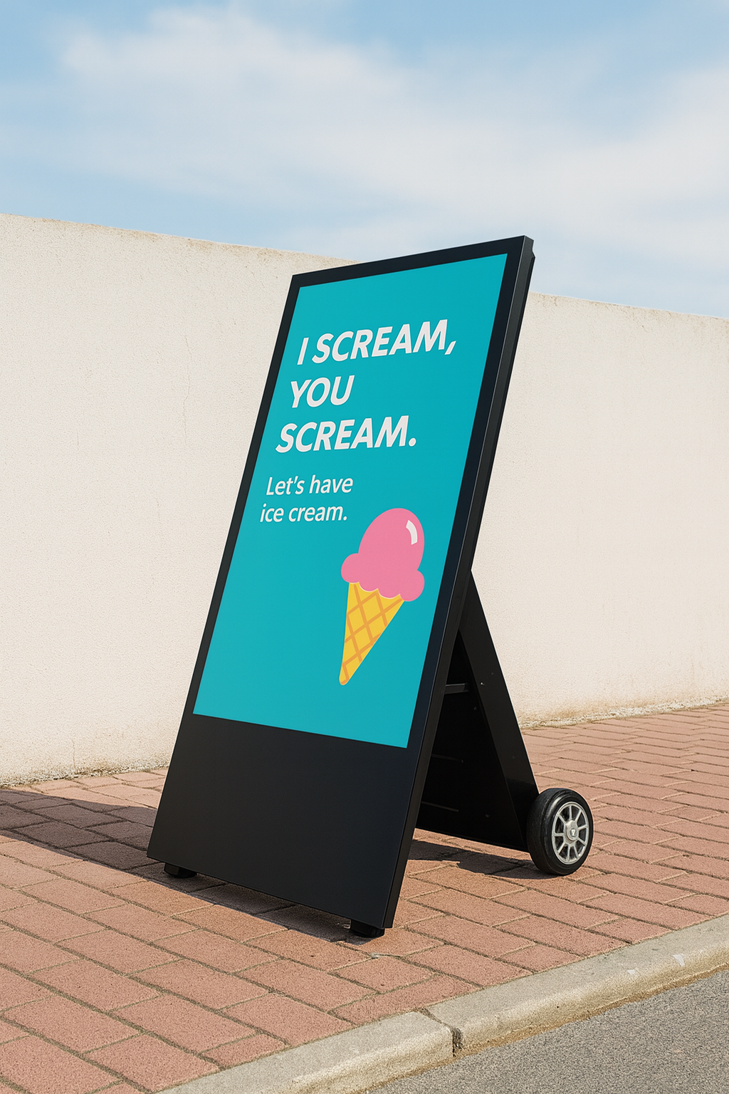 At Essex Banners, we know how important it is for your brand to stand out — rain or shine, day or night. That’s why we’re proud to offer the 43″ Outdoor Digital Battery A-Board, one of the most advanced pavement signage solutions on the market. Combining high-impact visuals, long-lasting battery power, and rugged weather protection, this digital A-Board is the perfect way to take your promotions to the next level.
