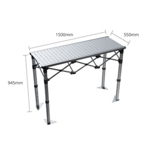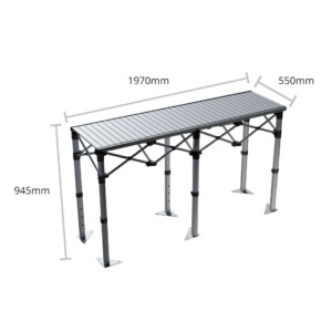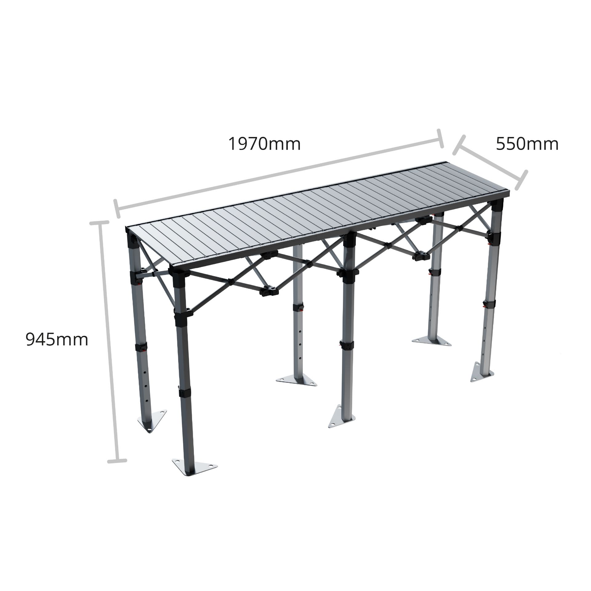 A: Setup is incredibly fast. Thanks to the tool-free “scissor-frame” design, one person can have the frame expanded and locked into position in under 60 seconds. The rolling aluminium tabletop then simply clips into the support bars.