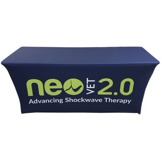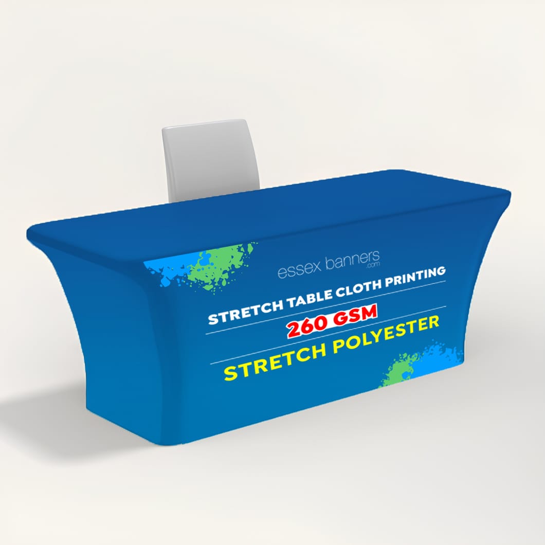 Stretch table cloth covers are perfect for use at almost any exhibition or event. It’s a full colour, stretch fabric graphic that simply pulls over the table and hooks around the feet, which is a more modern alternative to a standard tablecloth/drape.