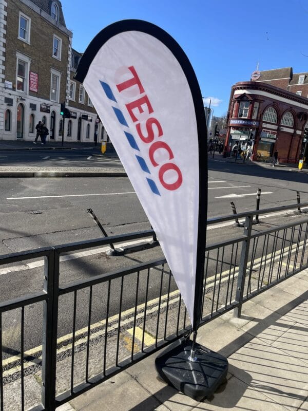 Teardrop flags Printed onto 117gsm Knitted Polyester with dye-sublimation process resulting in 80-90% show-through on the reverse.